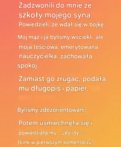 Nie podnosząc głosu, poprosiła o długopis i kartkę papieru i podała je naszemu synowi.