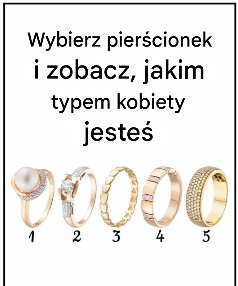 Spójrz na pięć pierścionków na powyższym obrazku i wybierz ten, który od razu do Ciebie przemawia. Nie zastanawiaj się za długo i wybierz ten, który najbardziej do Ciebie pasuje. Po dokonaniu wyboru przeczytaj poniższy opis, aby odkryć, co Twój wybór mówi o tym, jaką jesteś kobietą.